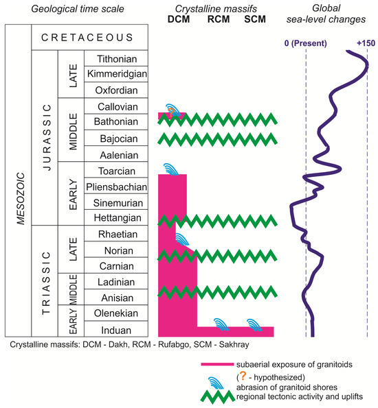 A proposed model of the chronology of exposure of granitoids on Triassic–Jurassic seashores in the study area. Global sea-level changes are shown for reference according to Haq [50,51].