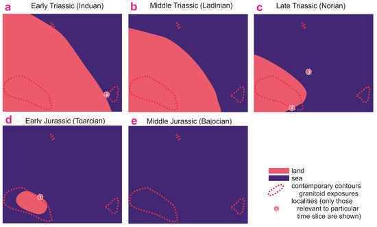 The established chronology of exposure of Carboniferous granitoids on Triassic–Jurassic seashores of the study area (Figure 6) facilitates the understanding of the local palaeogeography (Figure 7a–e). First, it appears that the three massifs formed a “core” of an ancient landmass (a possible island), which existed at the Permian–Triassic transition and diminished in size in the Early Triassic when the Rufabgo and Sakhray massifs were drowned. Indeed, this island was larger in size in the Late Triassic than in the Early Jurassic because Norian weathering-related breccias from Locality 3 were located far northward than Toarcian marine conglomerates from Locality 1 (Figure 1b). Second, the sea transgressed more actively from the east than from the north because Locality 3 remained land until the mid-Norian. Third, although all three massifs can be parts of a single igneous body emplaced in the late Carboniferous, they had already separated in the palaeogeographical sense in the Triassic. For instance, the distance between the Dakh Crystalline Massif and Locality 5 is very short (<10 km), but a denudation of granitoids of this massif in the Late Triassic did not result in massive accumulation of the related clasts at Locality 5.