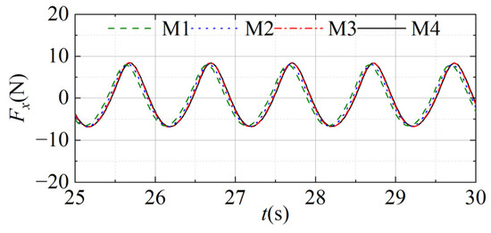 Time series of the horizontal wave forces under different mesh resolutions.