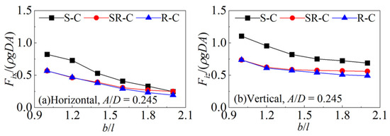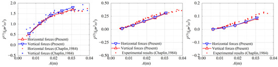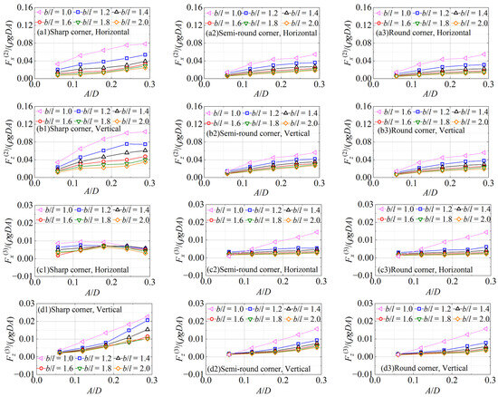 To examine the effects of aspect ratio and wave amplitude on the wave forces, the comparisons of the first harmonic wave forces on different section cylinders are shown as functions of the wave amplitude in Figure 6. For the three section corners considered in the simulations, the first harmonic forces are larger at the smaller b/l. The dimensionless horizontal and vertical forces show a similar trend under all b/l; that is, they decrease with the increase in A/D. The vertical forces are always larger than the horizontal forces, and with the increase in b/l, the differences increase gradually.