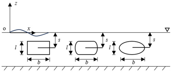 With the rapid development of computer technology, a number of numerical investigations on the interaction between waves and submerged horizontal cylinders have been carried out. The potential flow theory has been applied in related research due to its fast solving speed. Feng et al. [4] analyzed the characteristics of high harmonics in the focus wave group by using a nonlinear potential flow model. The high harmonic wave-height coefficients for wave groups with different steepness were calculated, and the nonlinear focus wave group was reconstructed with the obtained wave-height coefficients. Subsequently, Feng et al. [5] studied the characteristics of high harmonic wave forces on cylinders under extreme wave action. By comparing the experimental data with the results obtained from a fully nonlinear potential flow model, it was found that there were differences in the third harmonic component of the forces, while the other harmonic components were in good agreement. With the attention paid to the viscosity of fluid and rotation in flow, related studies have been carried out based on the viscous flow theory successively. Hu et al. [6] constructed a viscous flow numerical method to study the effects of a partially submerged cylinder on wave-height attenuation under different conditions of submerged volume and proposed a semi-analytical method to study this issue. Referring to Chaplin’s [1] experimental setup, Tavassoli and Kim [7] established a two-dimensional numerical wave tank model based on the viscous flow theory by using a mixed finite difference and finite volume method. The wave forces on a submerged horizontal circular cylinder were calculated under a lower Reynolds number (Re) and were significantly larger than the experimental data. Teng et al. [8] used a viscous flow model to calculate the forces on a horizontal submerged cylinder under nonlinear wave action. The study focused on the difference between the viscous flow results and potential flow results and explained the reason by analyzing the characteristics of the flow field around the cylinder. Gu et al. [9] simulated the characteristics of multi-scale vortices in a cylindrical wake at Re = 9500 based on the viscous flow theory and found that cavitation causes vortices to adhere to the surface of the cylinder, thereby suppressing vortex shedding. By using a two-dimensional viscous flow numerical model, Zhou et al. [10,11] studied an oscillating horizontal circular cylinder under wave and current action. The study found that the motion response of the semi-submerged cylinder is greatly affected by the flow, and the vertical vibration amplitude of the cylinder is relatively small; the motion of the quarter-submerged cylinder is mainly affected by the waves, and the vertical vibration amplitude of the cylinder is relatively large. These conclusions are helpful to better understand the dynamic response of horizontal floating cylinders under the combined action of wave and current, and have important guiding significance for the design and safety of offshore engineering structures. Ding et al. [12] established a viscous flow numerical model and studied the interaction between internal solitary waves and a series of double cylinders. The study found that the vortex distribution and vorticity intensity around the cylinder are susceptible to the vertical position of the cylinder and the distance between the two cylinders. In order to avoid the horizontal fluid loads on submerged structures, a flat cross-sectional form is often adopted for the main structure and supporting structure of immersed tube tunnels, submerged floating tunnels, and sea-crossing bridges in engineering.