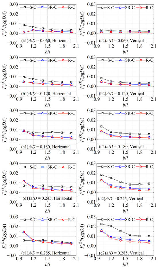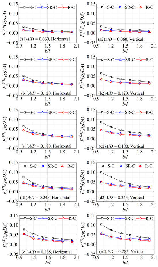 The second harmonic wave forces on the cylinders under different cross-sectional corners as functions of the aspect ratio are shown in Figure 7. In the legends, ‘S-C’, ‘SR-C’, and ‘R-C’ represent the cases with the sharp corner, semi-round corner, and round corner of the cylinder sections, respectively. It can be seen that the second harmonic horizontal and vertical forces on the cylinder with semi-round corners are close to those on the round-corner cylinder, and smaller than the forces on the sharp-corner cylinder. As b/l increases, the differences between the second harmonic forces on cylinders with different sections gradually narrow. It indicates that the nonlinear effects are significant in the second harmonic forces, especially in the cases of sharp-corner sections, and this effect becomes greater when the b/l is smaller. Unlike the characteristics of the wave forces on a circular cylinder, for the second harmonic component, the horizontal forces are no longer close to the vertical forces; that is, the vertical forces are greater than the horizontal forces under the sectional conditions of the sharp corner, semi-round corner, and round corner. The reason is although there is no change in the submerged volume and characteristic size of the cylinder, the projected area in the horizontal direction gradually decreases when the cross-sectional shape tends to be flat. The dimensionless second harmonic horizontal and vertical forces on the cylinders have a decreasing trend with the increase in b/l.