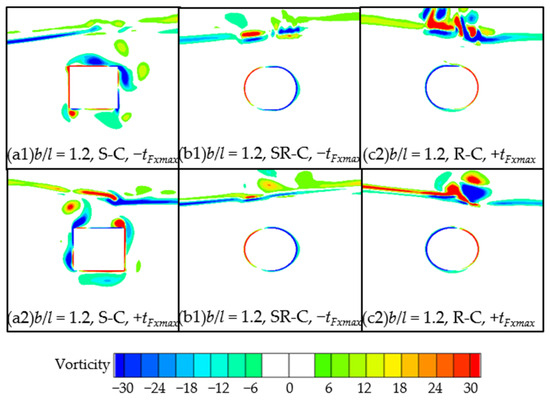 The vorticity field around the cylinders at the moments when the horizontal wave forces on the cylinders with different cross-sectional corners reach extreme values is shown in Figure 10. The cases at A/D = 0.285, with b/l = 1.2, are taken as examples. In the figures, ‘−tFxmax’ and ‘+tFxmax’ represent the moments when the horizontal wave forces reach the negative and positive extremes, respectively. Although the cylinders with different section corners have the same projection surface in the horizontal direction under the same characteristic size, as b/l increases, the cross-sections of the cylinders tend to flatten, and the vertical projection area gradually decreases. This causes the vertical forces to be larger than the horizontal forces for the first harmonic component on the sharp-corner, semi-round-corner, and round-corner cylinders. It is obvious that the disturbance of the free surface above the cylinders weakens with the increase in b/l, and this means the nonlinear effects of the free surface on the wave force decrease gradually. It is easy to understand that the nonlinear effects increase gradually with the increase in A/D in the second and third harmonic wave forces on the cylinders. The vorticity field shows that, by comparison, there are stronger vortices generated around the sharp-corner cylinder. This suggests that the corresponding higher harmonic forces show more remarkable nonlinear characteristics because of the stronger vortex effects.