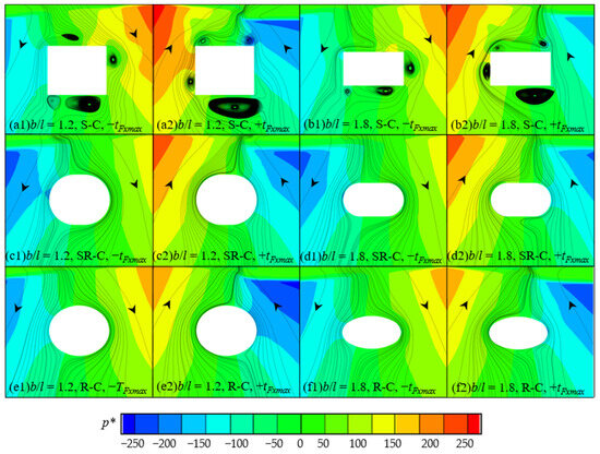 The dynamic pressure field and streamline distribution around the cylinders when the horizontal wave forces on cylinders with different cross-sectional corners reach extreme values for the cases of A/D = 0.285, and b/l = 1.2 and 1.8 are shown in Figure 11. It can be found that under the same aspect ratio and incident wave condition, the characteristics of the pressure field and streamline distribution around the semi-round-corner and round-corner cylinders are similar. As the aspect ratio gradually increases, due to the increasingly flattened cross-section shape, the influence of the semi-round-corner and round-corner cylinders on fluid flow and the motion of vortices around the cylinder gradually decreases, so the degree of flow field similarity gradually increases. However, the pressure and streamline distribution around the sharp-corner cylinder are significantly different from those around the semi-round-corner and round-corner sectional conditions. As shown in Figure 10, due to the relatively stronger vortices generated around the sharp-corner cylinder, the pressure distribution on the surface of the cylinder is affected by the vortices. This leads to the larger pressure forces on the sharp-corner cylinder. Therefore, the higher harmonic wave forces acting on the semi-round-corner and round-corner cylinders are relatively close to each other, and smaller than those on the sharp-corner cylinder. By observing the pressure field and streamline distribution around the cylinders, it can be found that with the increase in b/l, the similarity of the fluid field distributions under the different cross-sections gradually increases. Thus, the gaps between the dimensionless second harmonic wave forces on the different section cylinders are gradually narrowing. It indicates that as the cross-sectional shape of the cylinder tends to be flatter (b/l increases), the nonlinear effects decrease gradually on the higher harmonic wave forces on the cylinders, and the corresponding dimensionless forces decrease.