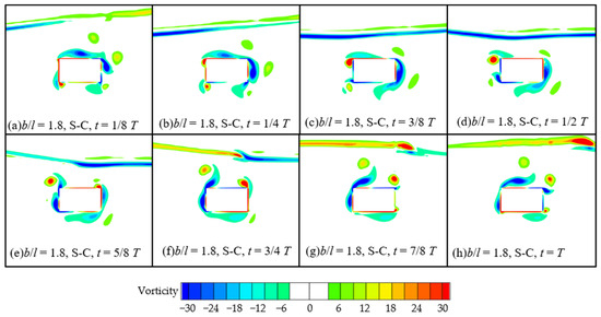 Considering the complexity of the vorticity field around the sharp-corner cylinder, The motions of the vortices around the cylinder at some instantaneous positions within a wave period are shown in Figure 12. The cases at A/D = 0.245 and b/l = 1.8 are taken as examples. The vortices are generated by the action of waves on the cylinder, and rotate clockwise around the cylinder with the motion of water particles in the wave field within a wave period. During the process of revolving around the cylinder, the vortices mostly adhere to the surface of the cylinder, and while gradually dissipating, they are also being generated synchronously. There is no significant phenomenon of periodic vortex shedding. Combining the vorticity field characteristics around the cylinders shown in Figure 12, the vortices around the sharp-corner cylinder under wave action are more significant and complex than those around the semi-round-corner and round-corner cylinders. It is necessary to further analyze the characteristics of the wave forces through force decomposition. For the small b/l, the height of the cylinder section is relatively large. In the process of the vortices around the sharp-corner cylinder, there are more extensive motion paths and longer time of vorticity dissipation and vortex formation on the side walls. This leads to the nonlinear effect of vortex motion on higher harmonic horizontal forces, which is different from the other cross-sectional cases. Thus, the special nonlinear characteristic of the third harmonic horizontal forces sharp-corner cylinder is observed at the small b/l as shown in Figure 8.