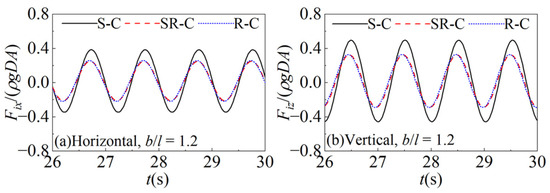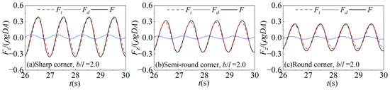 To further analyze and explain the characteristics of the wave forces, the inertial forces on the sharp-corner, semi-round-corner, and round-corner cylinders under the same aspect ratio are compared, and the time series of the inertial forces are shown in Figure 14. In the cases of A/D = 0.245 and b/l = 1.0, in both the horizontal and vertical directions, there are significant differences in the inertial forces acting on the cylinders with different section corners. The magnitudes and phases of the inertial forces on the semi-round-corner cylinder are relatively close to those on the round-corner cylinder. The inertial forces on the sharp-corner cylinder are the largest, and their phases, by contrast, are hysteretic.