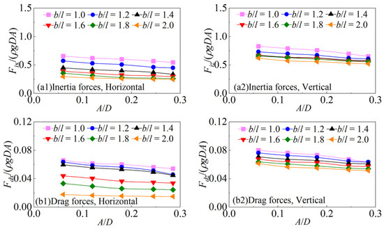Taking the cases of the semi-round-corner cylinder at A/D = 0.245 under various b/l as examples, the comparisons of the inertial and drag forces on the cylinder with different aspect ratios under the same wave amplitude are shown in Figure 16. With the increase in b/l, the projection area of the cylinder in the vertical direction decreases, which leads to the decrease in the drag forces in the horizontal direction. However, due to the projection area in the horizontal direction remaining unchanged, there is no significant change in the vertical drag forces. In either the horizontal or vertical direction, the inertial forces are smaller with the larger b/l. That is because the submerged volume of the cylinder decreases with the increase in b/l. Therefore, for the first harmonic wave forces on the cylinders with various cross-sectional corners, with the increase in b/l, the dimensionless horizontal and vertical forces gradually decrease. From the numerical results, the vertical inertia and drag forces on the cylinder are both larger than those in the horizontal direction. Thus, the vertical forces are larger than the horizontal forces in the first harmonic component, and the differences between the vertical and horizontal forces increase with the increase in b/l.