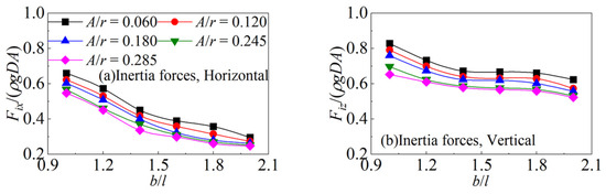 The inertial forces on the cylinders under the same aspect ratio at different wave amplitudes are compared. The cases of the semi-round-corner cylinder with A/D = 0.060, 0.120, 0.180, and 0.245 under various b/l are considered as examples. The comparisons of the inertial forces are shown in Figure 17. As shown in the figures, in the horizontal and vertical directions, the dimensionless inertial forces gradually decrease with the increase in A/D, and this characteristic of the inertial forces is also reflected in the cases with the other section corners and aspect ratios. This leads to the fact that with the increase in A/D, the dimensionless first harmonic horizontal and vertical forces on the cylinders show a gradual decreasing trend. Previous studies have summarized the reason for this phenomenon: because the lift force is close to the opposite direction of the inertial force, the lift effect increases with the increase in the wave amplitude, and the dimensionless wave force on the cylinder decreases.