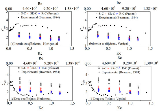 Combining the present numerical results of the inertial and drag forces, the hydrodynamic coefficients are obtained by solving Equations (10) and (11). The inertia and drag coefficients for the wave action on the submerged horizontal cylinders with various section corners and aspect ratios as functions of the Kc and Re numbers are shown in Figure 18. It is concluded that the inertia and drag coefficients all decrease generally with the increase in the Kc and Re numbers. The hydrodynamic coefficients are relatively larger for the cases of the sharp-corner cylinder and relatively smaller for the cases of the round-corner cylinder. Bearman et al. [31] experimentally studied the fluid forces and hydrodynamic coefficients on a horizontal rectangular cylinder in viscous oscillatory flow at low Kc numbers. The maximum values of the coefficients in the study were given as about Cm = 3.57 and Cd = 3.25. The present maximum inertia coefficients in the horizontal and vertical directions are about Cmx = 2.57 and Cmz = 2.68, which are smaller than those from the previous study. The maximum drag coefficients of Cdx = 3.65 and Cdz = 3.61 in the present study are larger than the previous results.