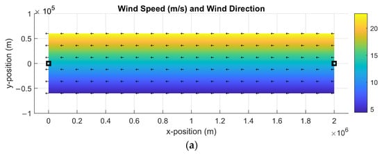 After ensuring the accuracy of the artificial neural network model, route optimization was carried out in several different conditions. In particular, three different wind conditions were considered, as shown in Figure 7. The first case, which is illustrated in Figure 7a, corresponds to head winds along the whole map, which is the worst wind direction condition. The second and third cases, in Figure 7b,c, are randomly generated weather conditions.
