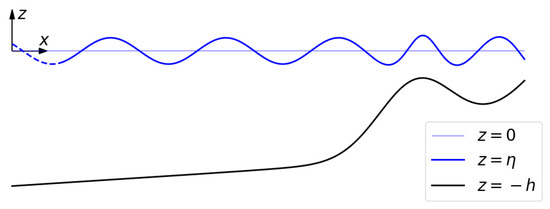 Throughout the work, will refer to the horizontal coordinates, and z to the vertical one, with at the mean sea water level, at the free surface, and at the bottom (Figure 1 for the one-dimensional case). We use the notation usually employed in water-wave textbooks as, e.g., those by Dean and Dalrymple [2] or Svendsen [3]. Also, as usual in depth-integrated models and many other wave propagation models, the flow is considered inviscid and irrotational [1,2,3,18], and the potential of the velocity is denoted with . In assuming, hereinafter, a rigid bed, the linearized equations for are [18]