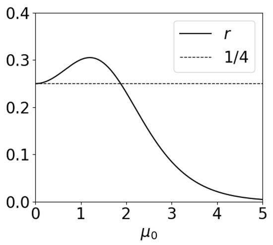 In Equations (47)–(49), the phase can be replaced with , because the differences between them are , therefore corresponding to the following order of accuracy in the WKB perturbative framework. Figure 2 shows the new function ; note that in shallow waters, r tends to , and Equations (48) and (49) reduce to Equation (4.5.13) in Mei [1]—after some rewriting of Mei’s equations.