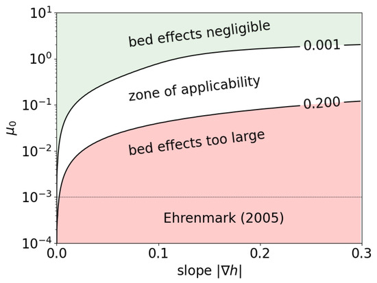 is small. Importantly, it is not just that must be small, but rather must be small compared to h, where is a measure of the depth change over a wavelength. Thus, the same slope can be considered mild or steep depending on , with slopes appearing milder in deep waters (large ) and steeper in shallow waters (small ). For values of ranging from approximately to , Booij [26] found that the mild slope hypothesis holds when (expressed in terms of instead of in the original work). Therefore, the mild slope condition can be more precisely stated as