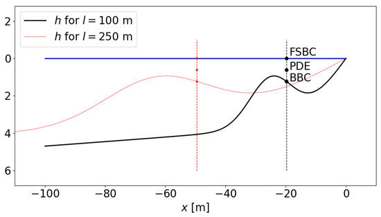 where and . Note that this profile has relatively strong slopes to enhance the influence of the bottom variations; a more realistic case would consider .