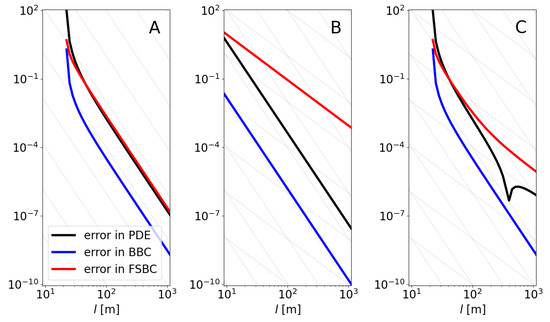 Evolution of the errors for equations using the proposed solutions. (A) Proposed solution (thin lines have slope , corresponding to ); (B) incorrectly using Burnside equation for k (thin lines have slopes and ); (C) using the proper k but introducing an error on purpose— instead of as it should according to Table 1 (thin lines have slopes and ).