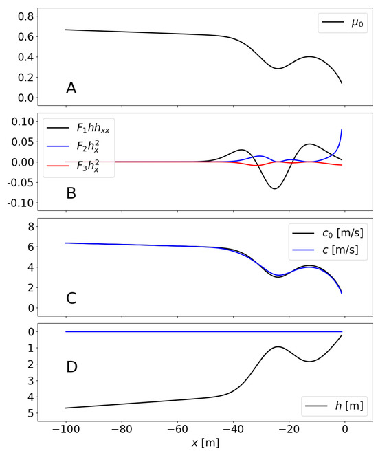 with and . Figure 8B shows the evolution of the three terms of the sum: the term dominates over the bar, while dominates very near the shore. As expected, the term is generally small. The wave celerities and are shown in Figure 8C, with the differences reaching values up to .