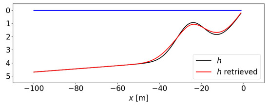 Figure 9 is meant to illustrate the consequences of using the leading-order dispersion equation in bathymetric inversion methods, by simulating the type of errors that can be incurred when disregarding the slope and curvature of the bottom. Figure 9 shows a bathymetry h, the same as in Figure 8D, the bathymetry retrieved using the leading-order dispersion equation (Burnside), and the wavenumber values obtained through the modified equation (i.e., the ones that would actually be observed). Linear waves of have again been considered. The maximum errors, i.e., the differences between the proposed bathymetry and the retried one are ∼20 cm in this case. If the characteristic length of the bathymetry, l, is increased to in Equation (76), i.e., in milder conditions, these errors are reduced to ∼5 cm. It should be noted that the bathymetric inversion algorithms have other difficulties related to the nonlinearity of the waves or the obliquity of the images that can be more relevant.
