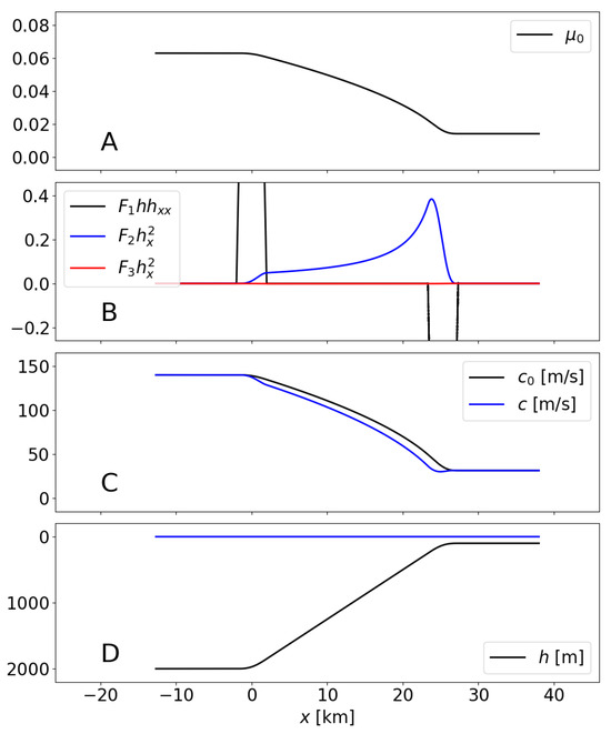 Figure 10 shows the most relevant results as in Figure 8. From Figure 10A, in all the domain, with in the shallower zone (continental shelf). Here, the values of are an order of magnitude smaller than in the previous example, which implies a more limiting condition on the maximum slope that can be handled. Figure 10B shows again the influence of each of the three terms summing up factor F in Equation (77). Owing to the way in which the bathymetry has been defined, is null over the whole slope (except in the junction areas), and the term is zero. Further, in the slope, as expected due to the small values of (Figure 3). In summary, the term dominates the slope, with increasing values as the depth decreases and reaching values of ∼0.4. The impact on the wave celerity is shown in Figure 10C; the traveling time of the wave over the part of the slope where is using and using the celerity c (i.e., ).