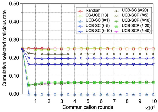 To evaluate the robustness of our policies under different levels of attack, we vary the average malicious device rate while keeping the other settings consistent. Some of the conclusions drawn earlier still hold. In Figure 6, we can see: (1) The cumulative selected malicious IoT edge device rates under the random policy and the CS-UCB policy are directly proportional to the global average malicious IoT edge device rate owing to the policies being unaware of security. (2) The growth rate of the selected malicious IoT edge device rate in relation to the global average malicious IoT edge device rate under the UCB-SC policy is positively correlated with number of voting interval rounds. (3) The selected malicious IoT edge device rate of the UCB-SCP policy grows slowly regardless of the number of voting and prediction model calculation interval rounds. Figure 7 presents that, based on the lower cumulative malicious IoT edge device rates, our proposed UCB-SC and UCB-SCP policies perform better in terms of a comprehensive consideration of the time efficiency and security for any malicious IoT edge device rate.