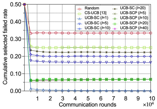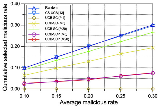 As shown in Figure 8, the performance gaps of the random policy and the CS-UCB policy decrease as the malicious IoT edge device rate increases. The reason is that there are fewer good IoT edge devices in , leading to a more constrained generation of so that in Formula (11) is smaller, but in Formula (11) is not affected under these two policies, which are unaware of the security. By contrast, the performance gaps of the UCB-SC policy and the UCB-SCP policy are stable with different malicious IoT edge device rates because security considerations contribute to similarly to .