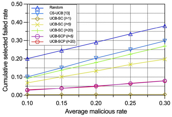 Performance comparison between different policies with varying average malicious IoT edge device rates in terms of cumulative selected failed IoT edge device rate.