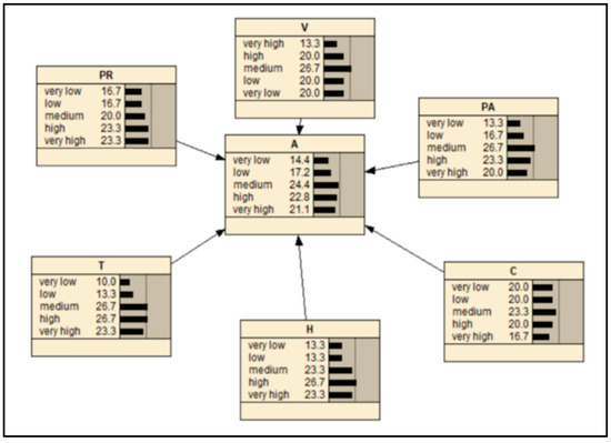 Once the construction of the fuzzy belief rule library for risk analysis of inland waterway vessel accidents is completed, Bayesian networks can be used for risk inference. The rule library with a belief structure will be represented in the form of conditional probabilities based on expert experience, i.e., the rule library will be modeled and transformed into a structure aggregated by 7 nodes. These 7 nodes will include 6 parent nodes (PR, V, PA, T, H, C) and 1 child node (R). After transferring the rule library to the Bayesian network, the rule-based analysis will be simplified to compute the marginal probability NR of the child node R: