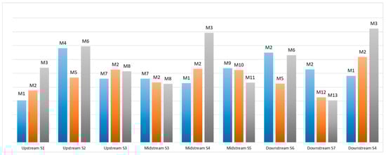 Based on the database of inland navigation accidents of the Upper Middle and Lower Yangtze River Maritime Administration (including reported and unreported data, accident reports, etc.), and with reference to the relevant literature [31,32,33] and inland navigation management norms [34], a total of 19 sources of risk with greater relevance to inland navigation safety of inland ships, and easily identified by the Maritime Administration and other departments, are refined from the influencing factors into four aspects: people, ships, environment and management. Using the fuzzy Bayesian model to assess the 19 preliminary proposed risk sources, according to the assessment results of the risk value of the size of the comparison, with the upper, middle and lower reaches of each screened out, the risk value of the three key risk sources are shown in Table 3. To screen out measures in order to cope with risks, three feasible measures for key risk sources in different segments were screened out for each with reference to the relevant literature and discussions among experts in the field, forming a risk response measures library. The three most important risk sources in the upstream are S1 adverse weather, S2 improper management of attached vessels, and S3 insufficient channel width affluence; the three most important risk sources in the midstream are S3 insufficient channel width affluence, S4 natural disasters (landslides, earthquakes, extreme flooding and drying, etc.), and S5 insufficient channel depth affluence; and the three most important risk sources downstream are S6 low crew quality, S7 high vessel traffic density, and S4 natural hazards (landslides, earthquakes, extreme flooding, etc.).
