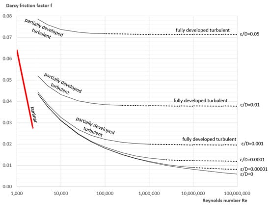 Moody chart for the Darcy–Weisbach flow friction factor, , as a function of the Reynolds number, and the relative roughness of inner pipe surface, . The red line represents laminar flow, full black lines represent partially developed turbulent flow, while point-lines represent fully turbulent flow.