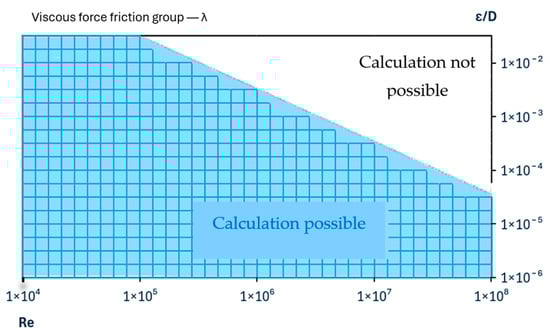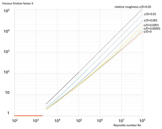 The transformed Moody chart based on the viscous friction group λ is given in Figure 2. In the laminar region of the diagram, λ = 1, while in the turbulent region, represented by the transformed Colebrook equation from Equation (4), the curves follow a continuous upward trend more accurately representing the physical behavior of flow friction phenomena.