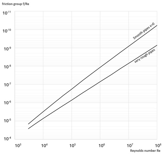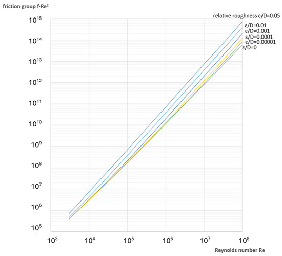 It is also possible to rearrange the diagram from Figure 2 for the calculation of flow discharge Q by replacing the viscous friction group λ with the friction group f·Re2. The Darcy–Weisbach flow friction factor f in Equation (7) should be calculated using Equation (3), with the main purpose of this transformation being used to produce a friction group that is independent of the velocity of the moving fluid υ, i.e., on the unknown flow discharge Q.