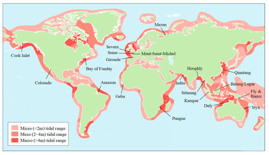 Tidal bores are remarkable natural phenomena in estuaries and bays [1], characterized by a sudden upstream surge of tidal water against the ebb flow [2,3]. This occurs due to the deformation of tidal waves in shallow water, creating a steep front or a series of wave trains that move upstream along rivers or through convergent bays [4,5]. Recent studies have identified tidal bores in 117 rivers across 25 countries [6]. As depicted in Figure 1, notable examples include the Qiantang River in China, the Amazon River in Brazil, Cook Inlet in Alaska, the Hooghly River in India, the Batang Lupar River in Malaysia, the Kampar River in Indonesia, and the Sittang River in Myanmar [7]. During a tidal bore, water levels can rise by over 3 m within seconds, with flow velocities reaching up to 12 m/s as the river rapidly transitions from ebb to flood tide [8,9]. These powerful waves exert increased pressure on the riverbed, affecting pore water pressure within the sediment and potentially leading to liquefaction. The complex interaction between hydrodynamic forces and sedimentary responses highlights the power and complexity of tidal bores, making them a compelling subject for research.