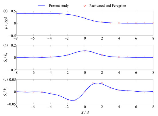 The results presented in Equation (51) can easily degenerate to the case of a rigid soil bed. A comparison between the degenerate solution and the analytical solution by Packwood and Peregrine [57] is shown in Figure 3. The calculation parameters are set as follows: tidal bore height H = 1.2 m, water depth d = 3.0 m, and soil bed thickness h = 3.0 m. For the rigid soil bed, G→∞, β→0. As illustrated in the Figure 3, the two solutions show good agreement.