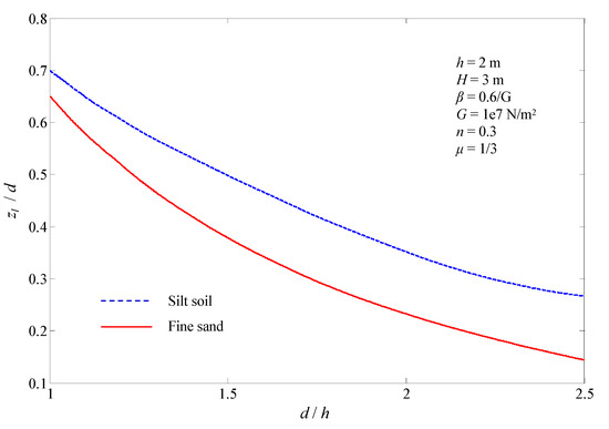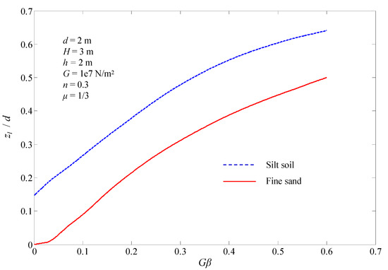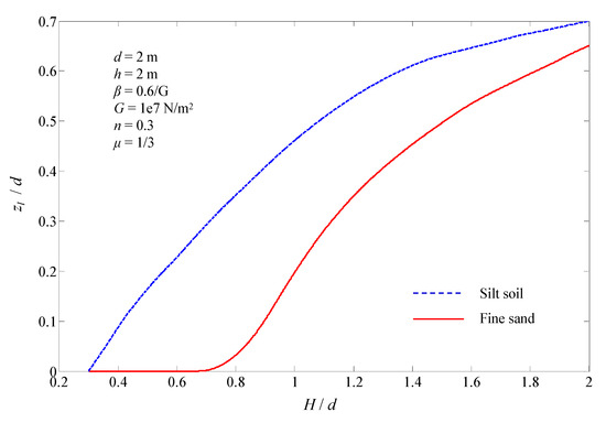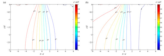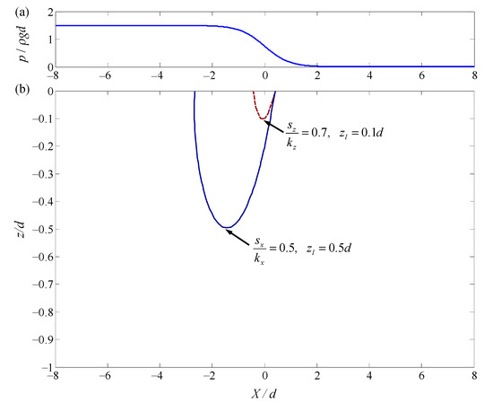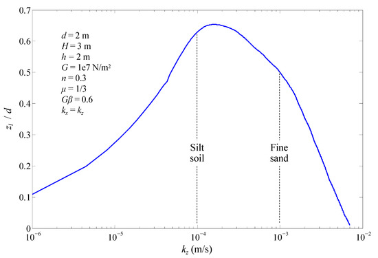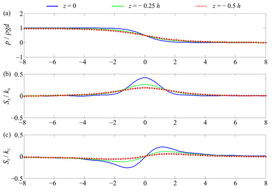 The degradation solutions of pore water pressure and seepage velocity caused by tidal bores have been validated using the analytical solution provided by Packwood and Peregrine [57]. Here, we provide more general and broader results regarding the riverbed response induced by tidal bores. In the example of riverbed response to be presented, the following common values are assumed: water depth d = 3 m, tidal bore height H = 3 m, riverbed thickness h = 9 m, permeability coefficient kx = kz = 10−3 m/s, Poisson’s ratio μ = 1/3, porosity n = 0.3, and shear modulus G = 107 N/m2. Given Poisson’s ratio μ and the shear modulus G, the Lame constant λ can be calculated using the following formula:
