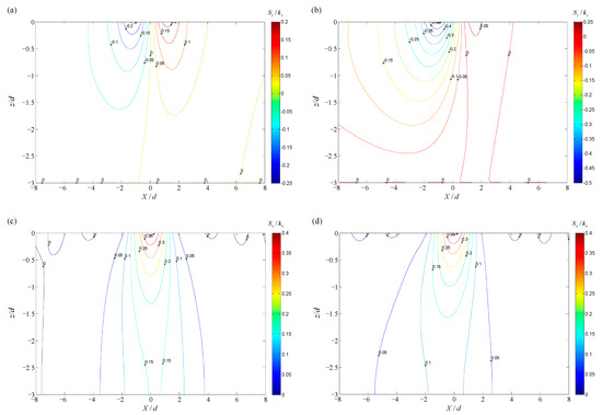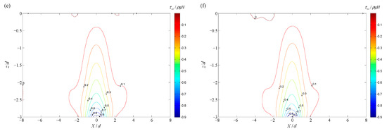 Figure 5 illustrates the contours of effective stress for two saturation conditions: fully saturated and nearly fully saturated. In the fully saturated scenario, the stress distribution is more localized, with concentrated regions of effective stresses occurring directly beneath the front of the tidal bore. In contrast, the nearly saturated condition results in a more dispersed stress pattern, with higher magnitudes of both compressive and tensile stresses extending across a broader area of the riverbed. The presence of air in the pores reduces pore water pressure, leading to an increase in soil compressibility and a wider distribution of stresses. When the riverbed is fully saturated, the effective stress distribution induced by the tidal bore is generally symmetrical about the front at X = 0. The impact of saturation on effective normal stress is greater than that on shear stress.