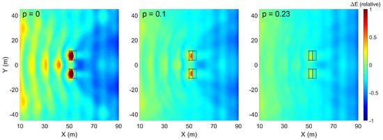 However, low porosity screens also tended to produce stronger reflective waves (), an undesirable side effect for the surrounding area. The breakwater with 10% porosity screens avoided producing reflective waves of higher amplitudes than the incident waves and still achieves nearly 50% transmitted wave energy attenuation in standard wind-wave conditions. The 10% porosity screens provided a larger area of attenuation behind the structure, evidenced by , compared to the 23% porosity simulation in Figure 4.