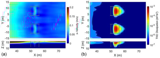 The semi-permeable design of the wave screen breakwater suggests that wave attenuation is influenced by reflection, diffraction, and dissipation. With a porosity of 10%, it is anticipated that wave orbital velocities passing through the voids create turbulence, consequently forming a wake behind the structure. To understand the dissipation effects on wave attenuation, wave orbital velocities, turbulent kinetic energy (TKE), and TKE dissipation are compared (Figure 5). The wave orbital velocities experience a decline near the breakwater, dropping from 0.2 m/s to 0.1 m/s within 8 m directly behind the structure (Figure 5a). Beyond this point, they begin to rise again, reaching 0.15 m/s for the subsequent 15 m, presumably influenced by wave diffraction. TKE dissipation takes place following the first screen, reaching its peak at the second screen with values around J/kg (Figure 5b). The dissipation remains notably high in the surface layer, with the wake extending up to 5 m behind the structure. While the observed values can be significant, they are confined to the structure and its immediate surroundings.