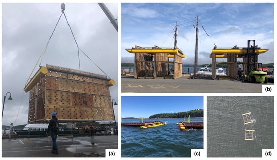 To study whether the laboratory and simulation results are impacted by scaling effects and tidal currents, the 1:2-scale breakwater was constructed throughout the month of May 2022 and deployed for field testing from 31 May to 5 August. All design parameters followed the optimized design in Figure 3, except the screens were spaced 2.95 m apart to match the characteristic wavelength of the field site in Beaufort sea-state 2 conditions. Units were constructed of wood, steel, aluminum, as well as poly-plastic pontoons and floating dock components for buoyancy (Figure 6). Each unit weighed approximately 5200 kg before deployment. Two units that were arranged laterally formed a complete breakwater assembly, which visually attenuated wave energy in the lee of the structure (Figure 6c,d).