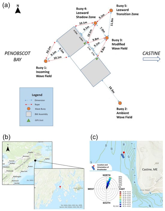 (a) Layout of breakwater and spotter buoys. The assembly was situated approximately 400 m from shore, and the primary wave direction was north-east. (b,c) Site map of data collection area in Penobscot Bay where the wave direction rose. Contour lines indicate seabed depth in meters. Three additional buoys are located 0.5 km south of the breakwater assembly to observe wave transformations.