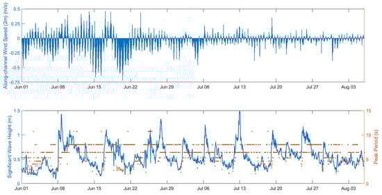 The field deployment site was located off the coast of Castine, Maine, in the upper Penobscot Bay (Figure 7). Penobscot Bay is a mesotidal system (tidal range varying from 2.9 to 4.9 m) that is part of the longest estuary in Maine and features a mean annual river discharge of 350 /s [46]. The topography of upper Penobscot Bay is complicated, marked by islands that limit the available fetch for wave growth. The predominate wind direction during the summer months is from the south/southwest [47]. To understand the wave response during storm events, wind and barometric pressure data were collected from the NOAA Buoy in Penobscot Bay, 44033, stationed in Southern Penobscot Bay to the East of Islesboro, approximately 40 km from the site (Figure 7b). Velocity data were collected at a 2 m depth from the UMaine NERACOOS Buoy F0135 in West Penobscot Bay at a more offshore location. Currents are tidally modulated and asymmetric, biased to being offshore due to the influence of river discharge. This is evidenced by flood velocities that reach up to 0.50 m/s, while ebb velocities reach up to −0.75 m/s (Figure 8 (top panel)). The wave environment closer to the mouth is often a wind-sea environment, with peak wave periods s, with limited swell events (Figure 8 (bottom panel)). Significant wave heights varied from typical values of 0.25 m during calm winds and could reach up to 1.5 m during storm events.