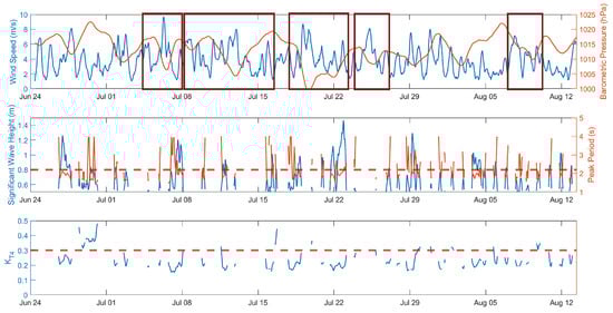 While on average, the breakwater attenuated at least 50% of the wave energy, it is important to understand the performance during different forcing conditions, such as storm versus non-storm conditions. From 25 June 2022 to 3 August 2022, seven frontal passages (28 June, 1 July, 6 July, 12 July, 19 July, 25 July, 2 August) were identified by drops in barometric pressure, P, greater than 5 hPa and wind speeds in excess of 5 m/s (Figure 10 (top)). During these periods, the wave environment was energetic compared to non-storm conditions, where m and s (Figure 10 (middle)). The frequency-dependent transmission coefficient at f = 0.4 Hz was near 0.27 during storm events immediately behind the structure at buoy 4, indicating 73% wave attenuation at these frequencies, compared to 0.25 during non-storm conditions (Figure 10 (bottom)). Breakwater performance improved beyond the average during storm events when wave heights were larger.