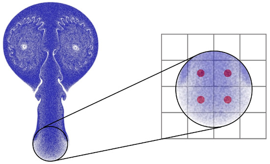 Figure 1. Schematic of vortex particle sampling. (Left): A 2D jet case. (Right): Close-ups of smoke source. The red balls are vortex particles. - (2)