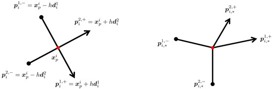 Here, the 2D situation is taken as an example. A local orthogonal frame system is defined for each vortex particle i. The rotation and scaling matrices are computed by advecting the reference frame. In Figure 2, the origin of the frame system is the position of the i-th vortex particle. Along each axis of , a set of sampling points is generated at a distance h from the origin. The position of sampling points are