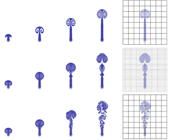 The 2D jet simulation with different configurations. (Top): Naive grid solver and low grid resolution (). (Middle): Naive grid solver and high grid resolution (). (Bottom): Grid solver with our detail enhancement scheme and low grid resolution ().