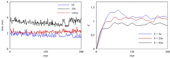 In addition to the visual results, the energy of the 3D jet is presented within 300 time steps. Here, is the volume of the grid cell. In Figure 4, the energies of the three cases show a general increasing trend during the initial stage of injection. After a period, the energy reaches a steady state. We found that large h results in a small energy level when the jet is in the stable state. We remark that the jet with a larger h can generate more small-scale vortices, which is the primary reason for increased energy dissipation.