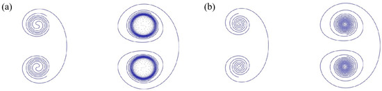 Point vortex simulation. (a) Our method. (b) Naive grid solver [15].