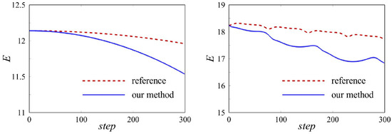 In the first experiment, a pair of point vortices with opposite directions is initialized within the flow field. Under mutual interaction, the two vortices exhibit a “drifting” motion, as shown in Figure 5. After a certain amount of time, the trajectories of tracer particles around the point vortices remain clearly visible in the reference solution. In contrast, the vortical structures in our method gradually became blurred. This is likely due to the low grid resolution. We remark that increasing the grid resolution can improve the clarity of the vortical structures. In the 2D leapfrogging simulation, results similar to the reference solution are produced by our method. Two pairs of point vortices exhibit repeated upward motion in a cyclic pattern, as shown in Figure 6. In addition, the energy of the point vortices and leapfrogging simulation is plotted, as shown in Figure 7. It can be observed that the high-resolution grid solver demonstrates better energy conservation properties in both experiments. However, under the influence of fluid viscosity, both methods experience varying degrees of energy dissipation.
