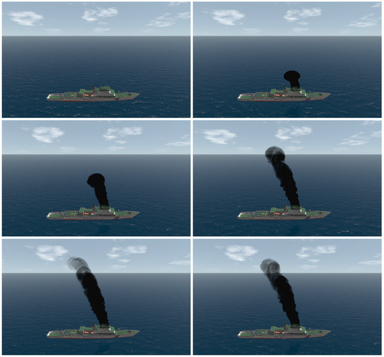Buoyancy plays an important role in smoke simulation, which is generated by the temperature difference between the smoke and the ambient air. However, the temperature field is not modeled due to the limitations of coarse grids. Solving the temperature field based on the coarse grid cannot capture the details of small-scale vortices. A constant upward velocity field is added to simulate the effect of buoyancy. The primary advantages of this approach are its simplicity in implementation and low computational cost. To simulate the influence of wind on the smoke, an inclined upward velocity field is set throughout the entire simulation domain. The upward background velocity field is set based on the empirical experience. The calculation formula is , where is the unit direction of the background velocity field and c is the empirical parameter. If the simulation results do not match reality, the parameter c is iteratively adjusted to ensure that the simulation results meet the expectations. The smoke rises from the bridge, subsequently ascending to form a dense plume, as shown in Figure 11.