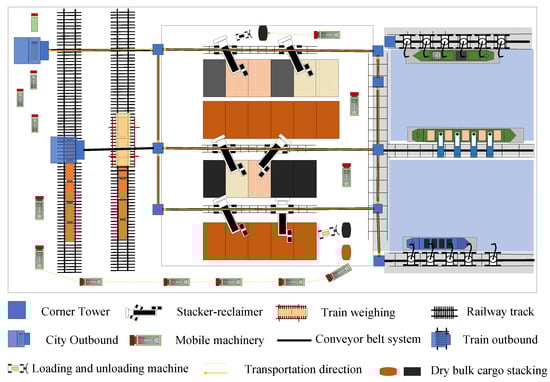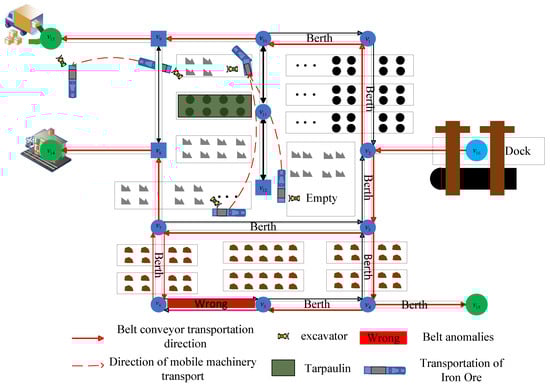 Yard structure modeling entails separating the yard into multiple parts and representing them using mathematical mappings. This method makes it easier to explain the physical structure of the yard mathematically. The majority of current research uses graph-theoretic modeling techniques. For example, Wu et al. [3] used adjacency matrices to indicate the accessibility between operational points and directed graphs to depict different yard elements based on the yard conditions of the coal–water intermodal storage and distribution base in Jing Zhou, Hubei. Robert et al. [4] suggested a yard structure modeling method to optimize scheduling for stacking and reclaiming operations. They modeled each stockpile as a collection of heterogeneous blocks of varied sizes, accurately expressing the stockpiles’ geometric shapes and variations. This model improves the quality of scheduling plans in the DBET scheduling engine, resulting in more accurate and efficient solutions. Although the relationship between mobile machinery, belt conveyors, and cargo cannot be adequately described, some studies apply mathematical restrictions to limit structural features.