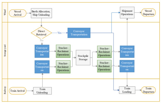 - van Vianen, T.A.V.; Ottjes, J.A.; Negenborn, R.R.; Lodewijks, G.; Mooijman, D.L. Simulation-based operational control of a dry bulk terminal. In Proceedings of the 2012 9th IEEE International Conference on Networking, Sensing and Control, Beijing, China, 11–14 April 2012. [Google Scholar]