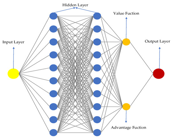 In typical Q-learning, the agent updates a Q-table to decide the optimum course of action in a specific scenario. However, this method’s efficiency falls as the number of states rises. This is addressed by DQN, which essentially replaces the Q-function with a neural network by allowing states to be input into the network in order to assess the value of each action in that state. It is possible to isolate the value function from the advantage function when working with complex states and actions. The selection process is driven by the value function, which assesses the worth of the upcoming action and condition. Equation (20) depicts the Q-value computation in the Dueling DQN architecture: